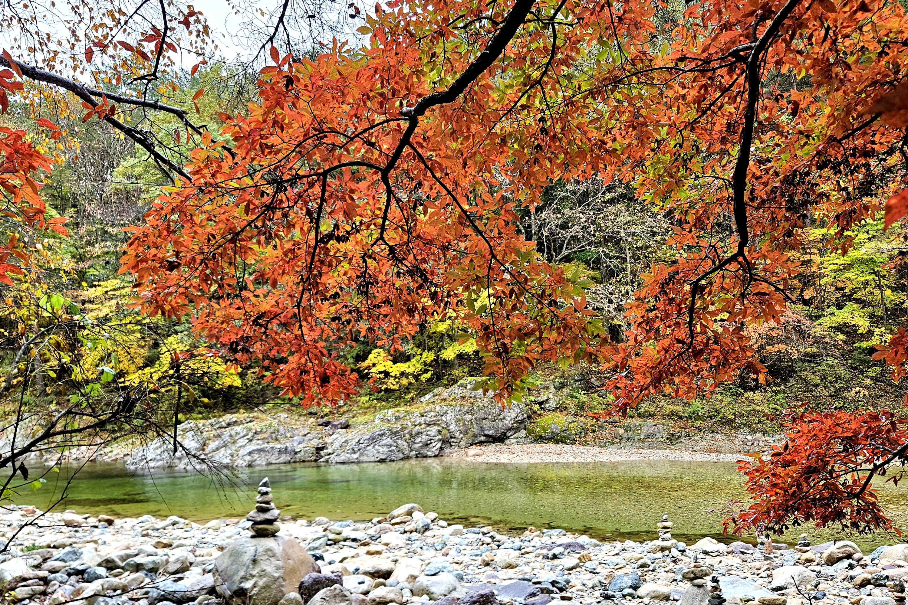 붉고 노란 단풍과 청옥색의 물빛이 만들어내는 환상적인 가을 풍경